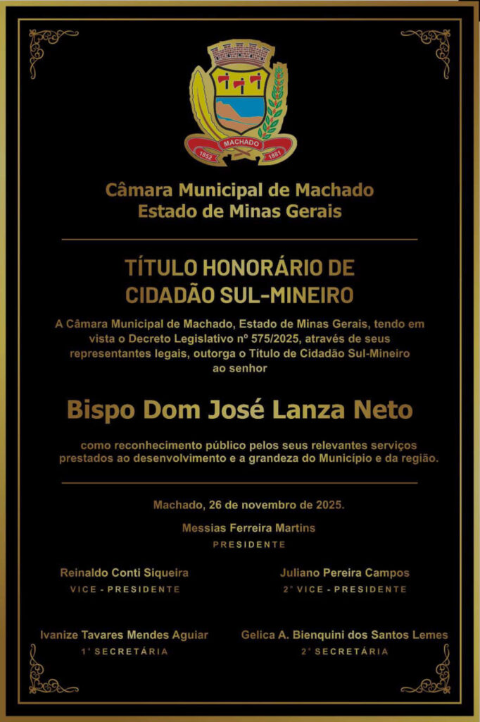 A cidade de Machado prestou uma homenagem especial ao bispo diocesano, Dom José Lanza, concedendo-lhe o Título de Cidadão Sul-Mineiro. A honraria reconhece o trabalho pastoral, social e evangelizador desenvolvido por Dom Lanza à frente da Diocese de Guaxupé, que abrange Machado e outras importantes cidades da região.