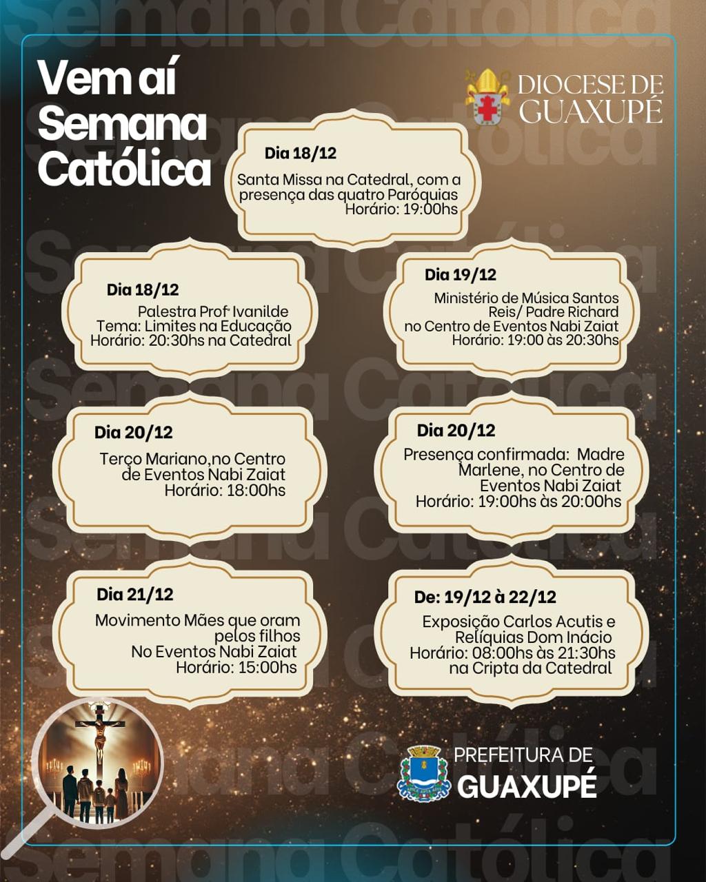 Na noite do dia 18 de dezembro, teve início em Guaxupé a 1ª Semana Católica, um momento inédito de fé, formação e convivência para toda a comunidade. A programação segue até o dia 21 de dezembro, reunindo uma vasta agenda de atividades religiosas, formativas e culturais, abertas à participação de todos.