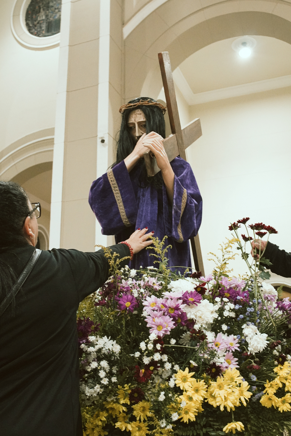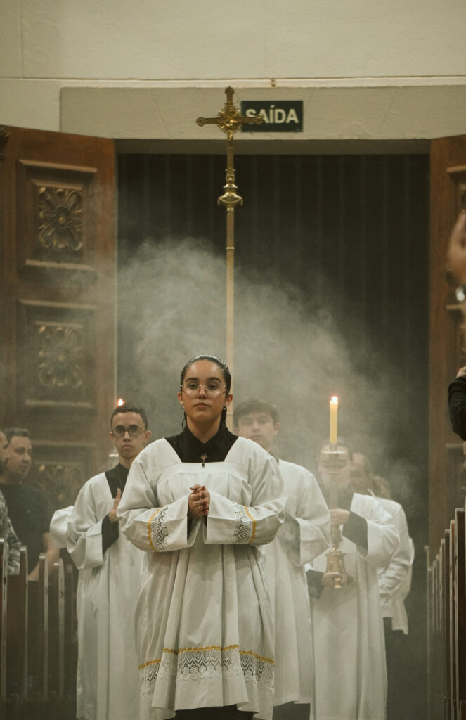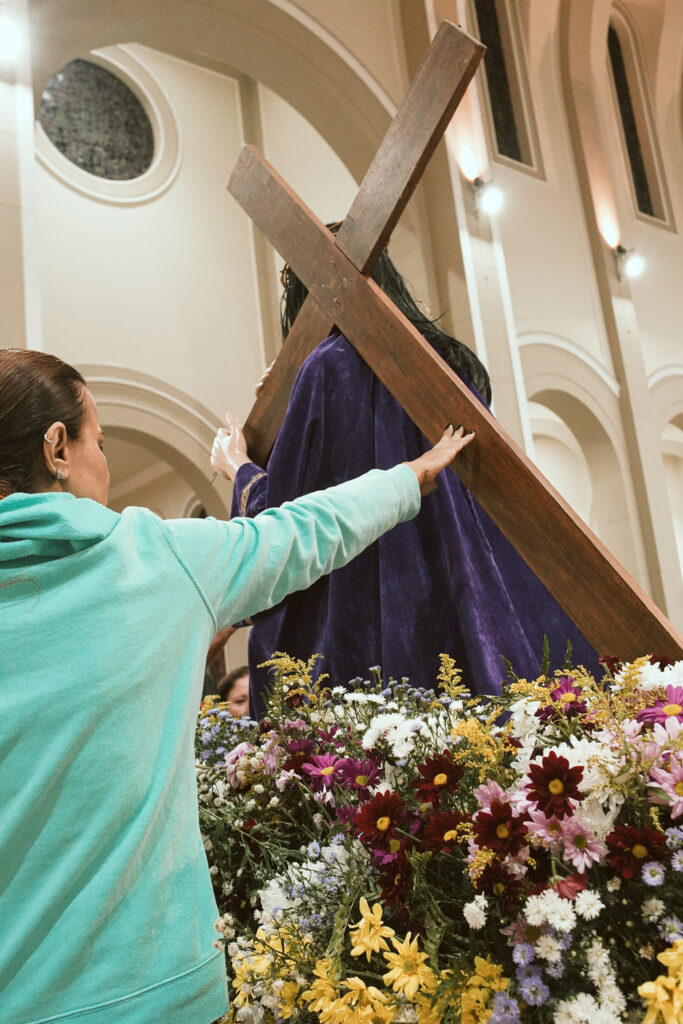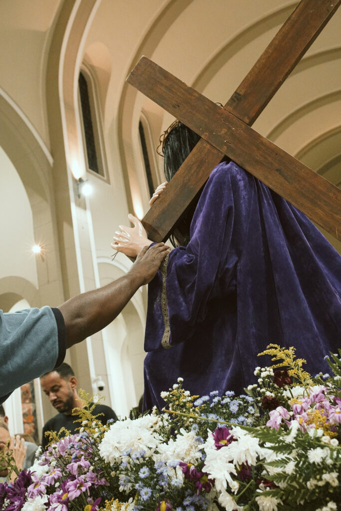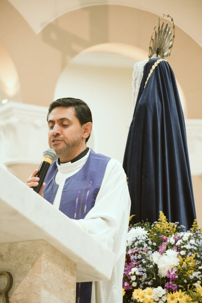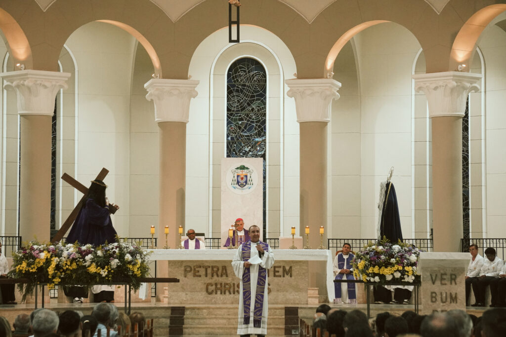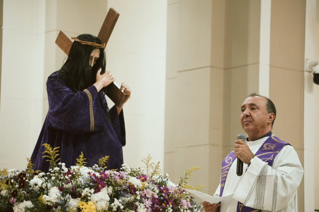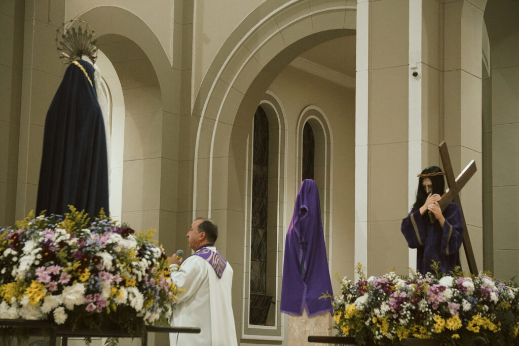 Durante a celebração, o Padre Clóvis conduziu o sermão refletindo sobre o comovente encontro entre Jesus e sua Mãe, Maria, no caminho do Calvário. Este momento, marcado pela dor e pelo amor, revela a união profunda entre o Filho que se entrega pela salvação da humanidade e a Mãe que, em silêncio e fidelidade, participa desse sofrimento. O olhar entre Jesus e Maria expressa uma comunhão de amor que ultrapassa as palavras, tornando-se sinal de entrega total à vontade de Deus.