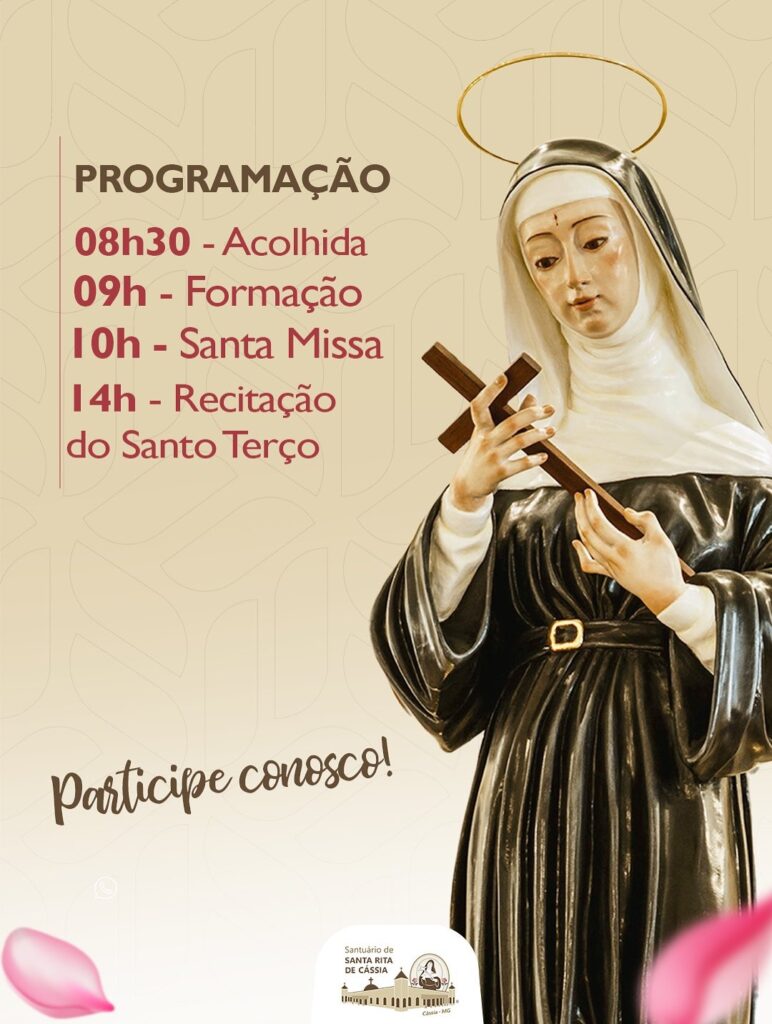 Às 10h, acontecerá o ponto alto do evento: a Santa Missa. Após o almoço, às 14h, haverá a recitação do Santo Rosário, encerrando mais um encontro de fé e devoção aos pés de Santa Rita de Cássia e de Maria Santíssima.
